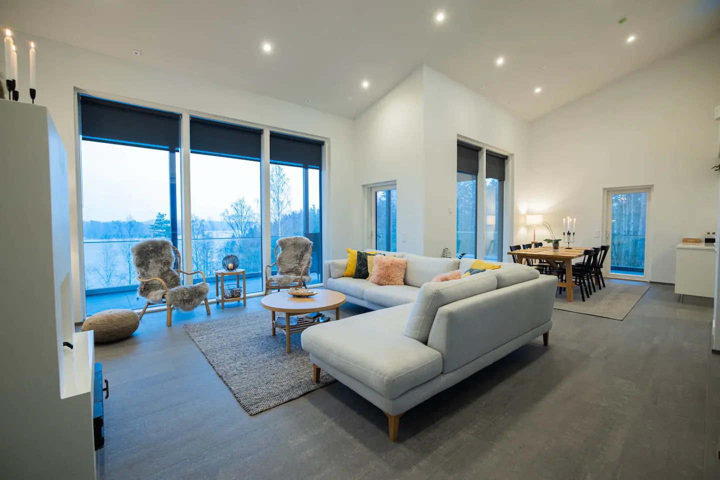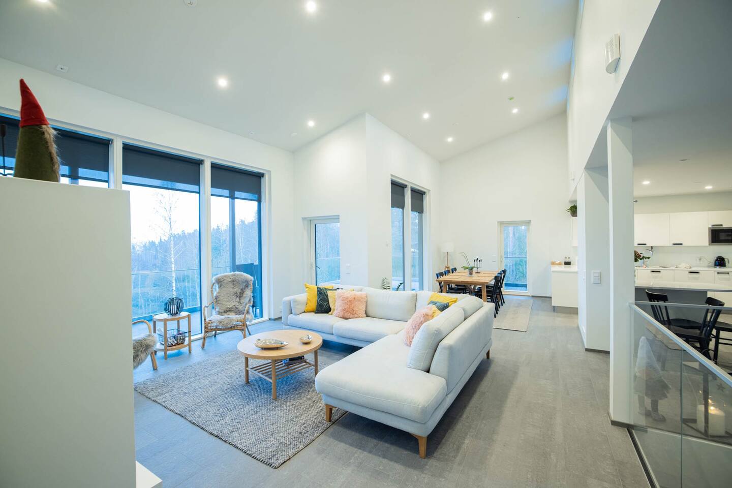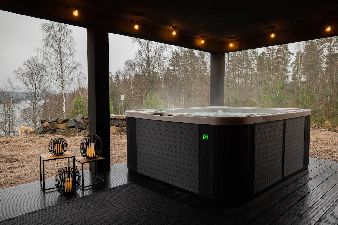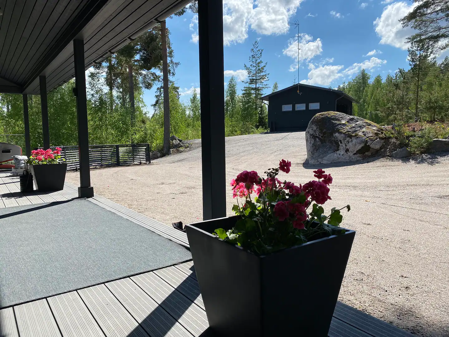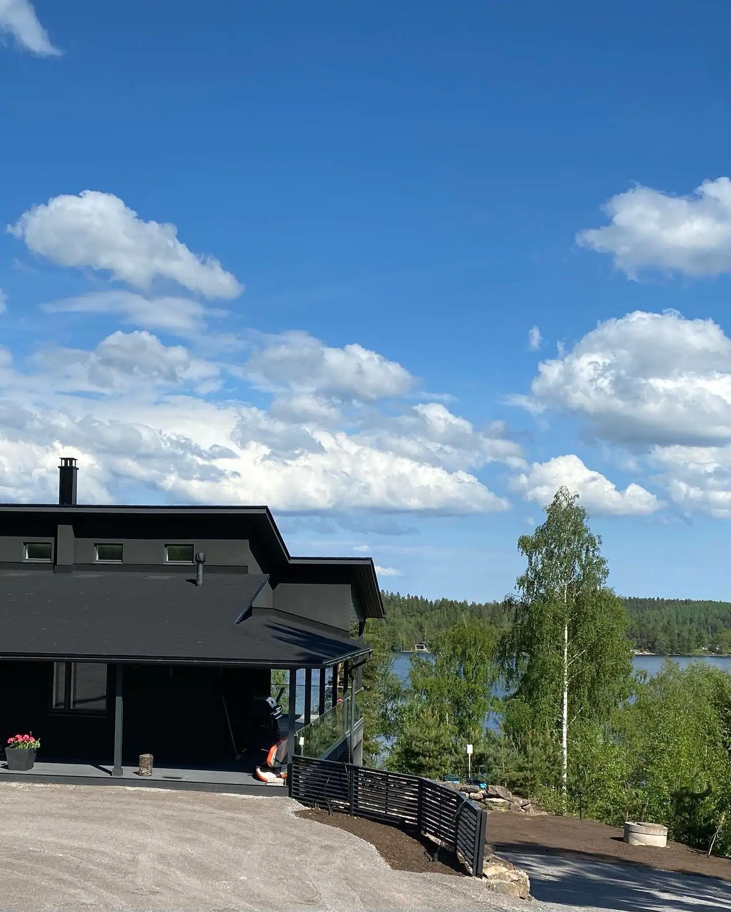 Lohjalla, Hormajärvellä, sijaitseva huvila on rakennettu pienen lahden poukamaan, niemen päälle, joten aurinkoa piisaa. Jopa pimeimpään vuodenaikaan auringonsäteet osuvat tänne, eritoten lämmitettyyn poreammeeseen 🤩