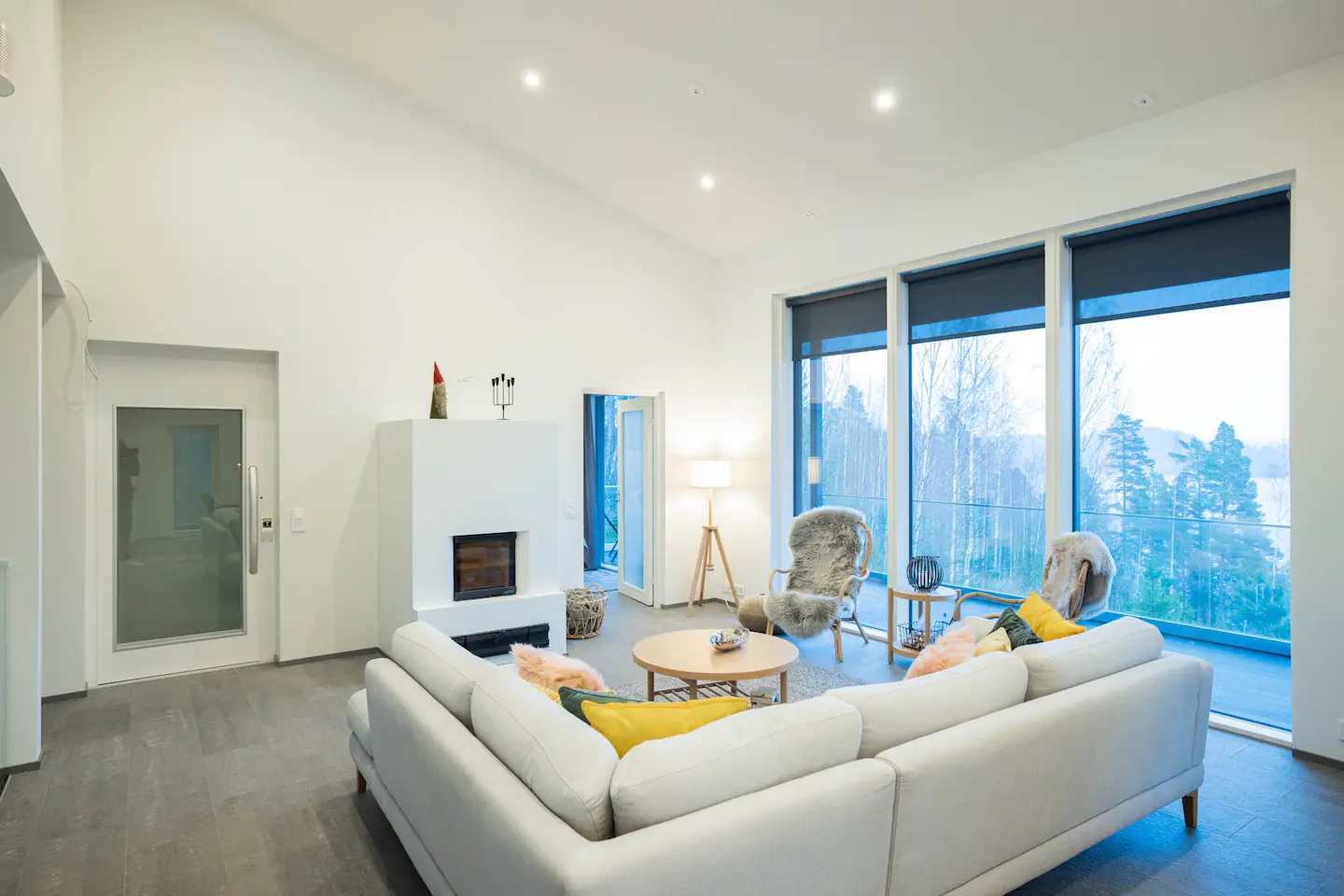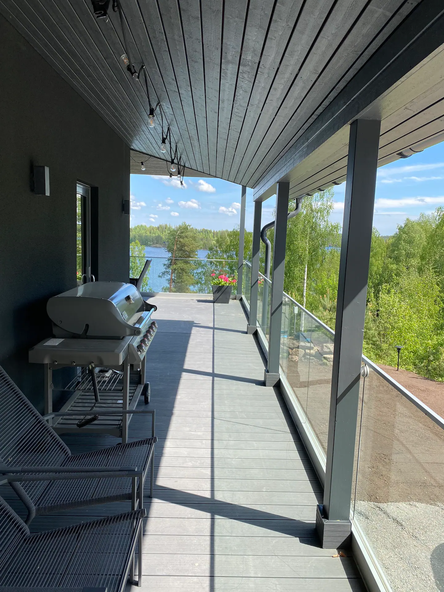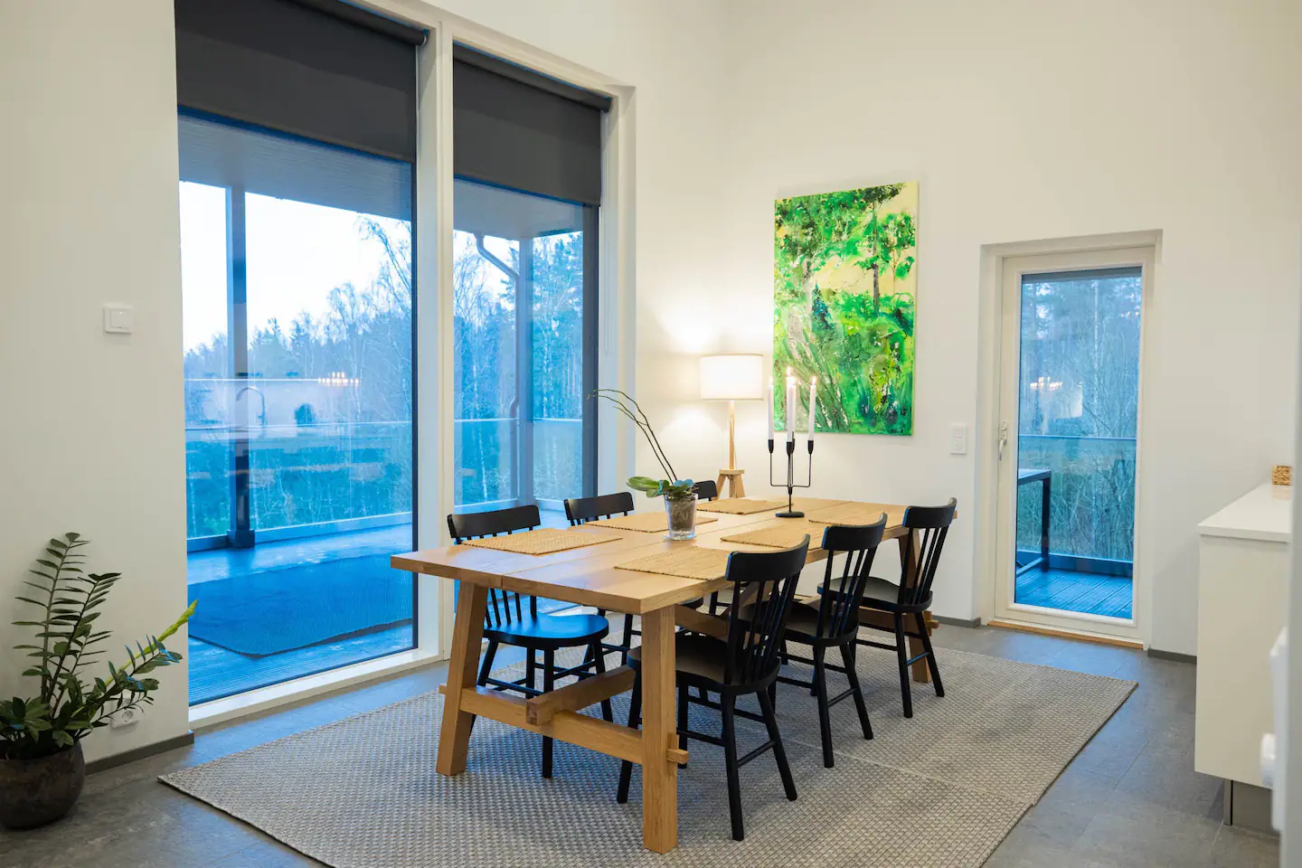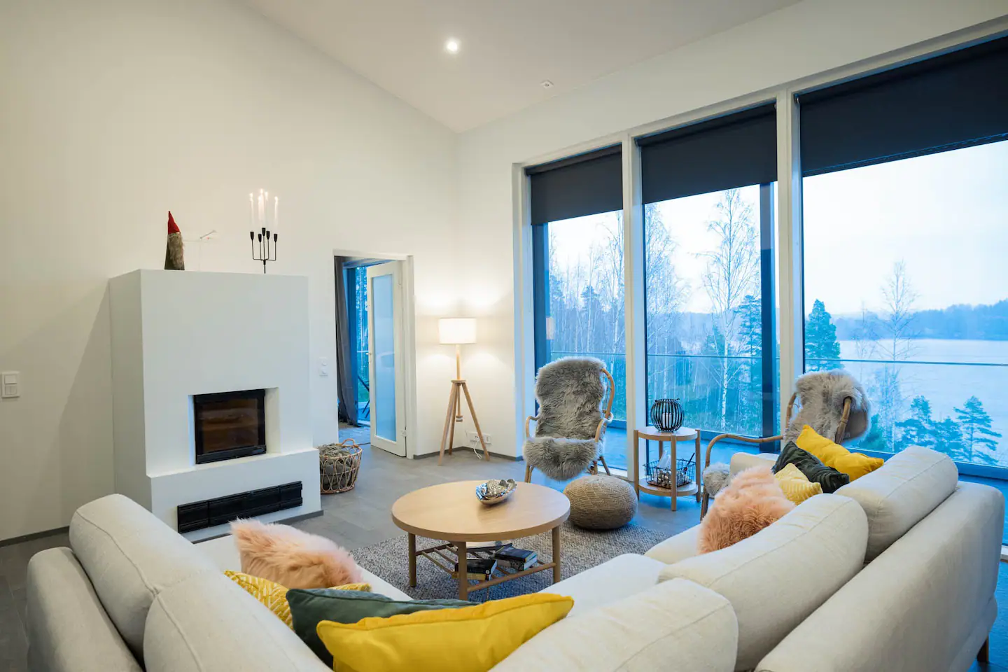 Lohjalla, Hormajärvellä, sijaitseva huvila on rakennettu pienen lahden poukamaan, niemen päälle, joten aurinkoa piisaa. Jopa pimeimpään vuodenaikaan auringonsäteet osuvat tänne, eritoten lämmitettyyn poreammeeseen 🤩