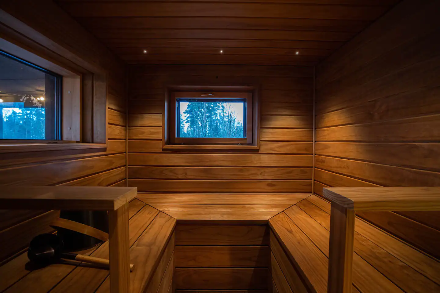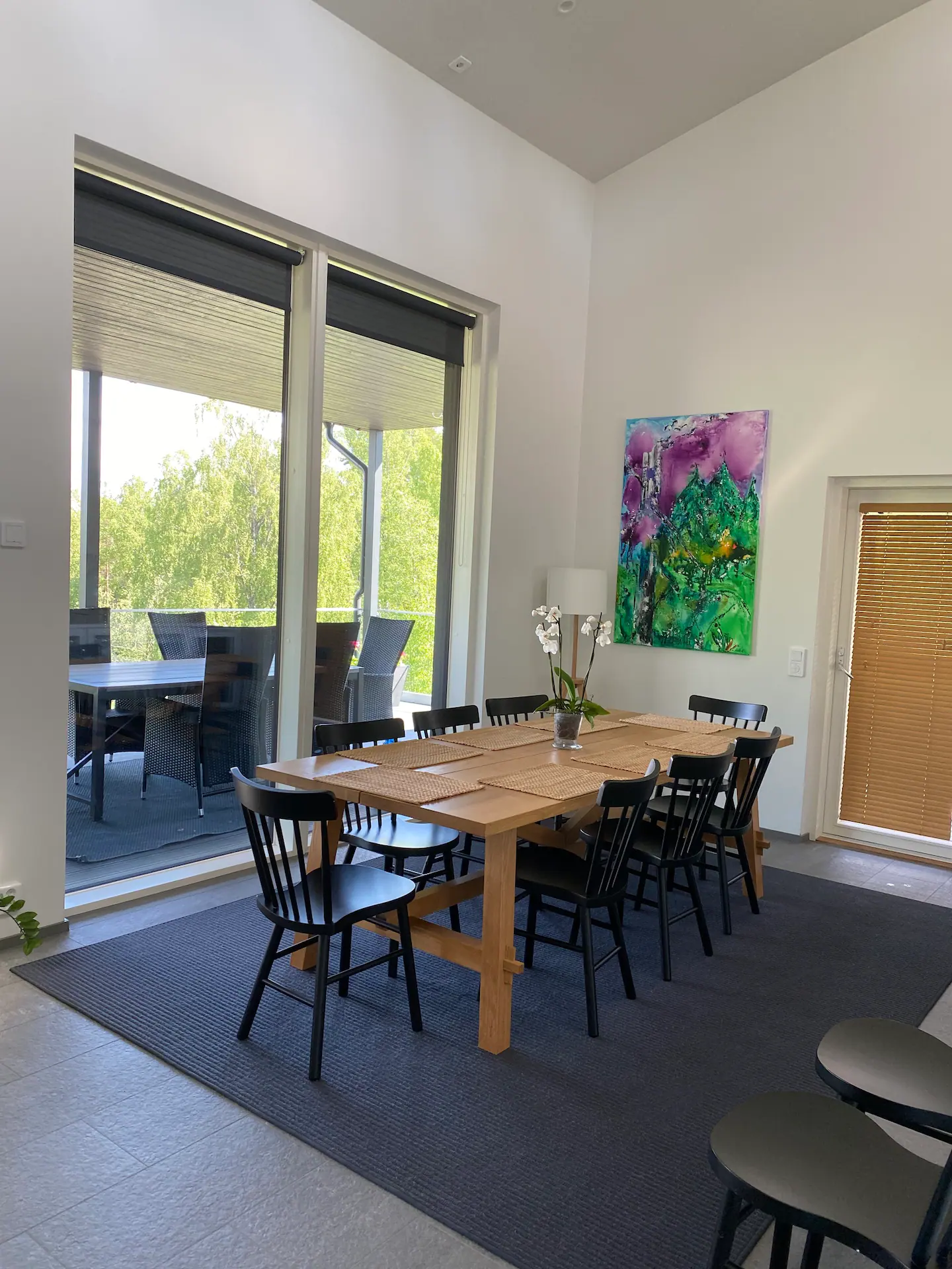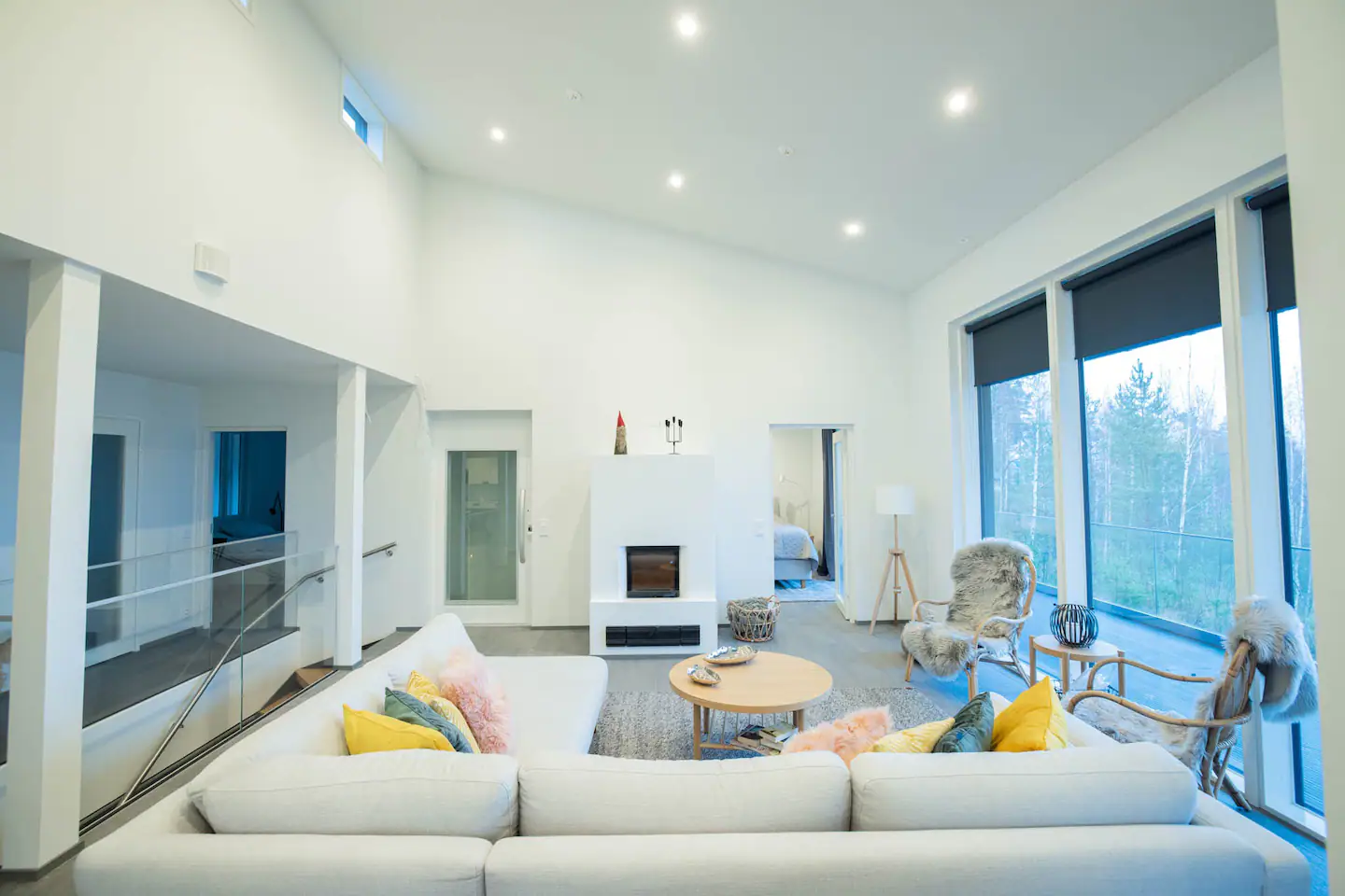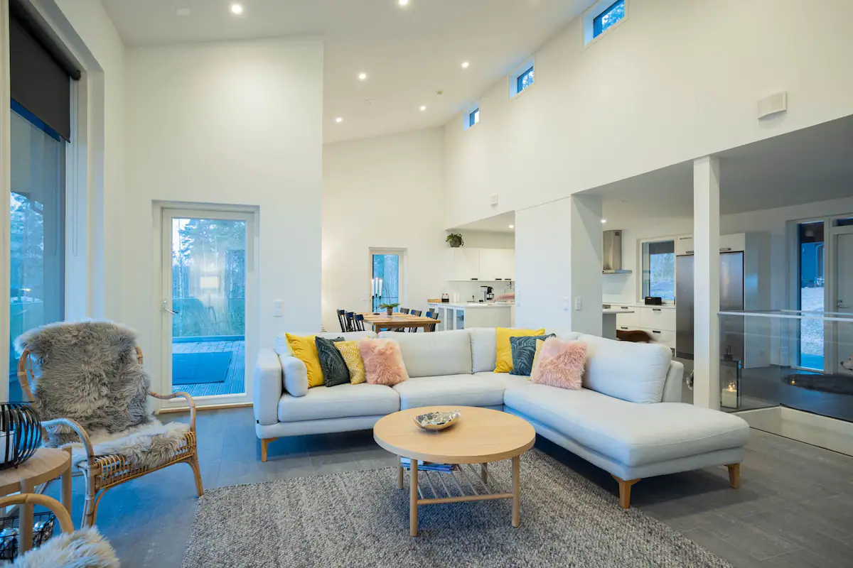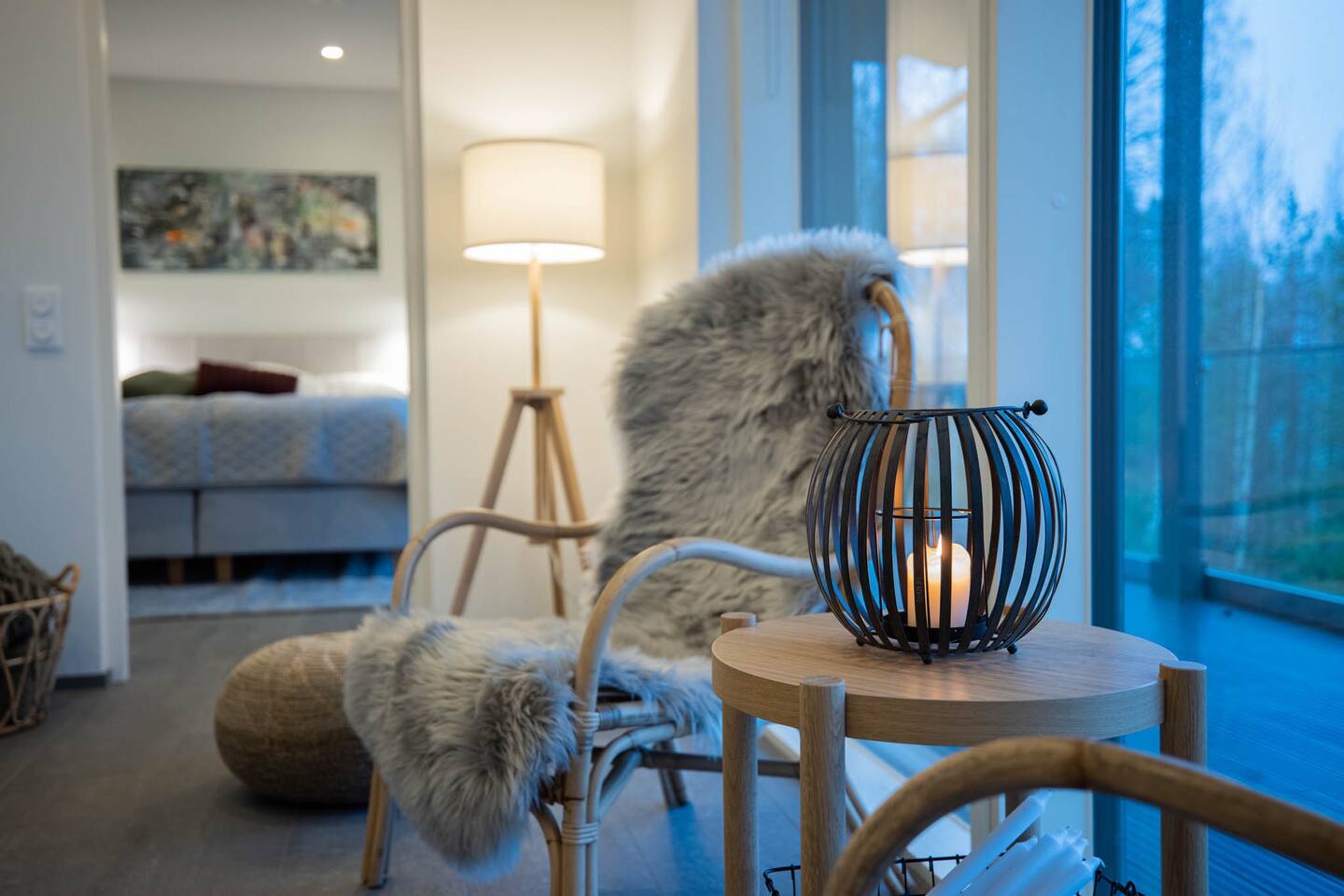 Lohjalla, Hormajärvellä, sijaitseva huvila on rakennettu pienen lahden poukamaan, niemen päälle, joten aurinkoa piisaa. Jopa pimeimpään vuodenaikaan auringonsäteet osuvat tänne, eritoten lämmitettyyn poreammeeseen 🤩